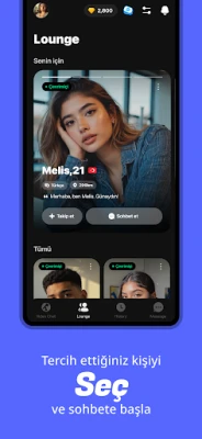 Cheero'nun akıllı eşleştirme sistemi, sizi sadece rasgele değil, gerçekten uyumlu olabileceğiniz kişilerle buluşturmak üzere geliştirilmiştir. Etkinliklerinize ve profil bilgilerinize dayalı gelişmiş algoritmalarımız sayesinde, her yeni etkileşim keyifli ve anlamlı bir deneyime dönüşür. Ayrıca, "Lounge" bölümünde çevrimiçi profillere göz atarak kimlerin sohbete açık olduğunu anında görebilirsiniz. Kendi seçiminizi yaparak, her konuşmayı kişisel ilgi alanlarınıza göre şekillendirirsiniz.